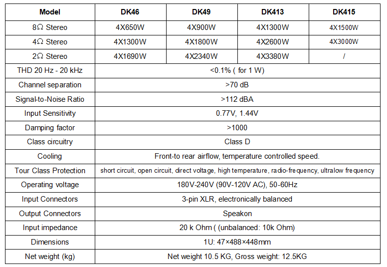 DK46 is high class 1U four channel digital amplifier, excellence shows in high efficiency and top class timbre.By adopting the ful-bridge low consumption powersupply, we can make it in small size and at the same time with strong dynamic.Besides, the module structure and electronicvolume control both reflect their value in practical and commercial field.Applied to road show, KTV, Club, church, wedding, theater etc events.