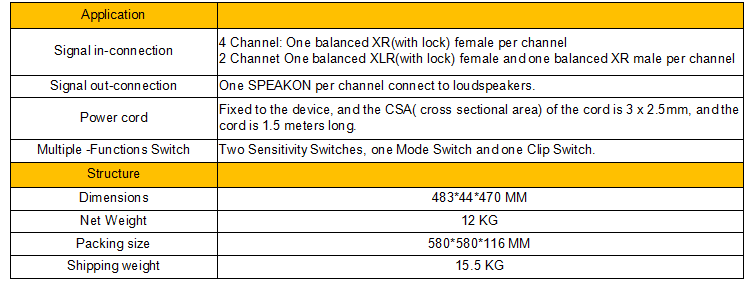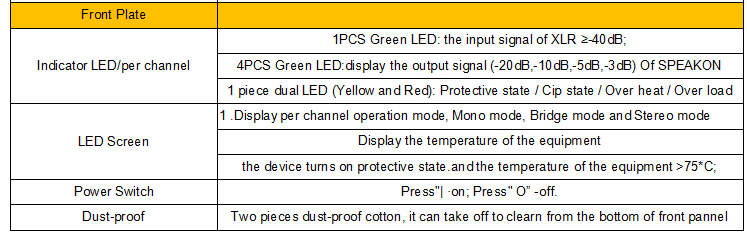 Temperature warning: when the temperature reaches 70℃, the LCD screen will give warning, the yellow temperature lamp will be on, the output power will be compressed according to the temperature variable, until the overheating warning is removed, so that the power amplifier will not appear after the overheating protection without sound phenomenon