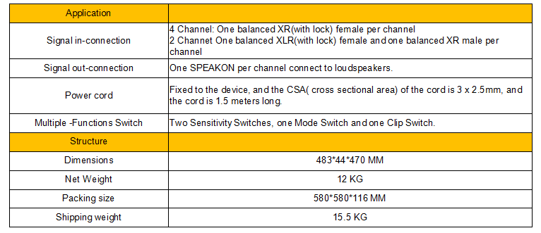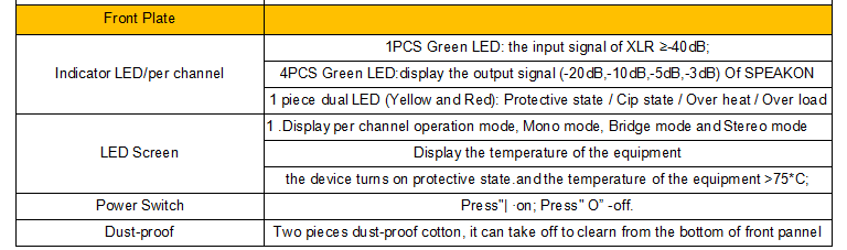 Temperature warning: when the temperature reaches 70℃, the LCD screen will give warning, the yellow temperature lamp will be on, the output power will be compressed according to the temperature variable, until the overheating warning is removed, so that the power amplifier will not appear after the overheating protection without sound phenomenon